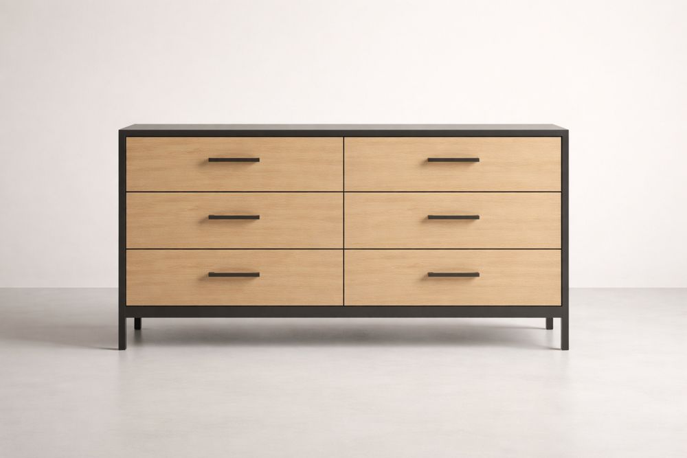 This dresser features six pull-out drawers made from wood veneer, complemented by a steel frame. It comes in a natural and black color scheme, with a matte finish. The dresser has dimensions of 150 cm x 50 cm x 85 cm and weighs 45 kg. Each drawer includes steel handles. Cleaning involves simply wiping with a damp cloth.
