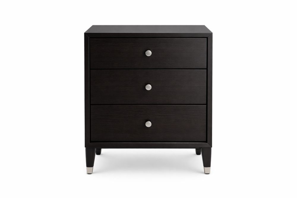 Dark engineered wood 3-Drawer Nightstand with Steel Knobs and Tapered Legs