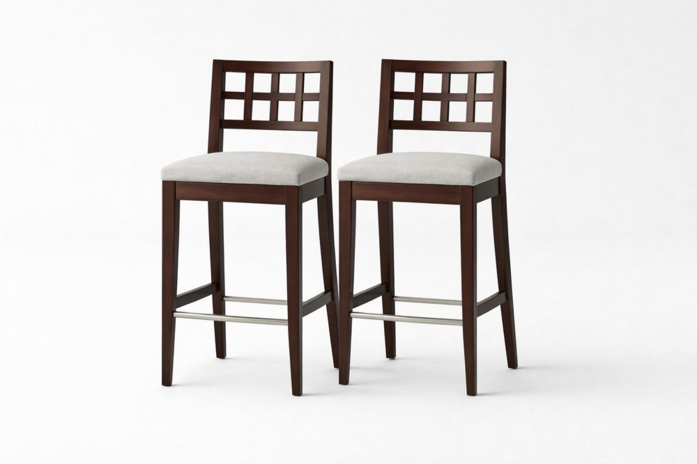 Set of 2 Bar Stools with Grid Backrest and Upholstered Seat in Solid Wood and Light Gray Fabric