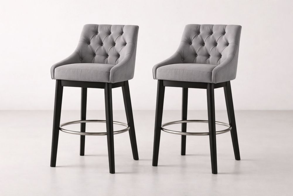 Set of 2 Grey Tufted Barstools with Black Legs and Polyester Upholstery