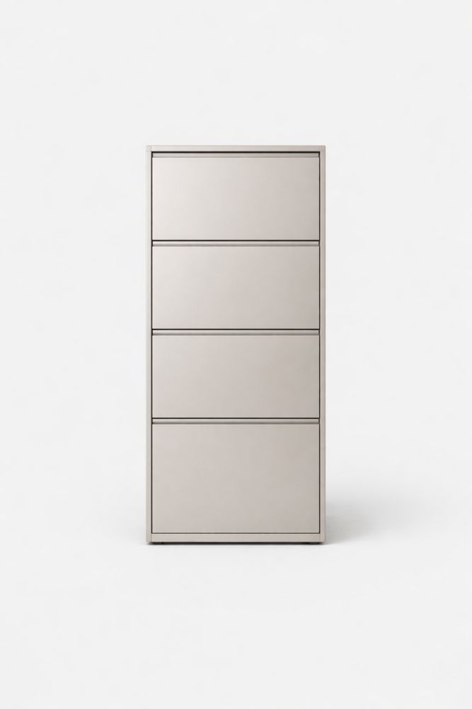 This filing cabinet is made of steel with a gray finish. It features four smooth glide drawers and a secure lock. The dimensions are 132 cm in height, 46 cm in width, and 62 cm in depth. The cabinet weighs 28 kg and does not require assembly. It is freestanding and includes keys.