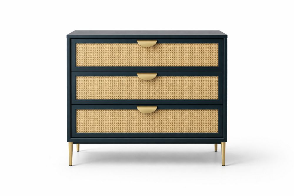 Three-Drawer Dresser with Rattan Fronts and Steel Legs - Black and Natural
