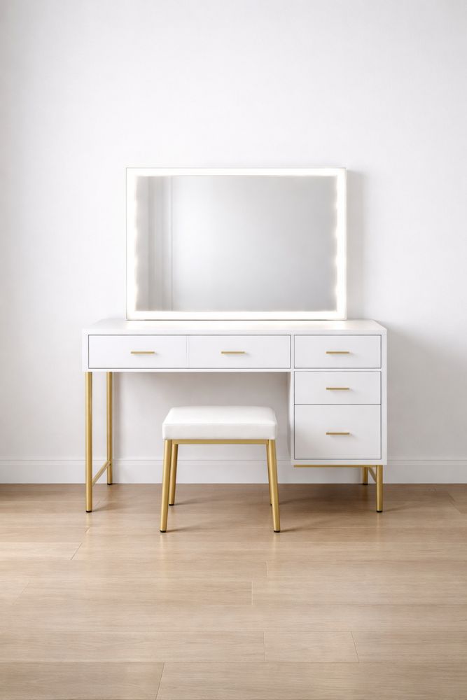 Dimensions: Table - Length 120 cm, Width 40 cm, Height 80 cm; Mirror - Length 100 cm, Height 60 cm; Stool - Length 40 cm, Width 30 cm, Height 45 cm