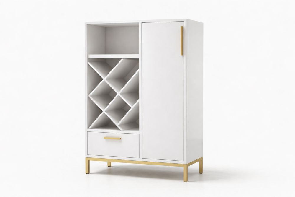 White solid wood Storage Cabinet with Wine Rack and Gold Accents 160cm x 90cm x 45cm
